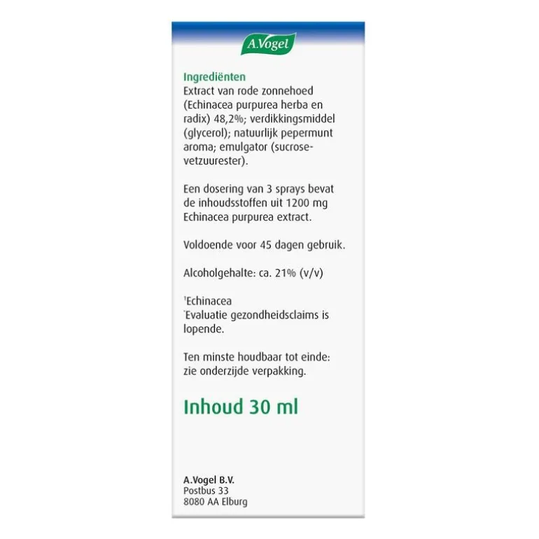 Het immuunsysteem ondersteunt de weerstand van het lichaam. Het behoud van een goed werkend immuunsysteem is belangrijk voor het behoud van een goede gezondheid. A.Vogel Echinaforce immuunspray1* helpt de afweer van het lichaam en heeft zo een positieve invloed op het immuunsysteem. Het voordeel van de immuunspray1* is dat het vloeibaar is en gelijk op je mondslijmvlies terecht komt. Zo wordt de actieve werkstof snel opgenomen.