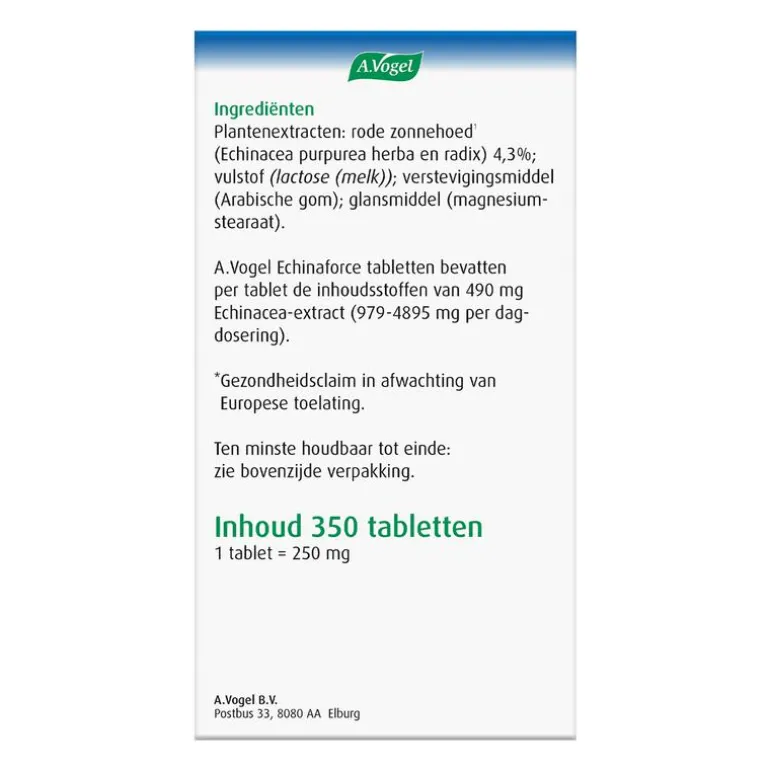 Rode zonnehoed1 (Echinacea purpurea herba en radix) 4,3%; vulstof (LACTOSE (MELK)); verstevigingsmiddel (Arabische gom); glansmiddel (magnesiumstearaat). Echinaforce tabletten bevatten per tablet de inhoudsstoffen van 490 mg Echinacea-extract (979-4895 mg per dagdosering).
