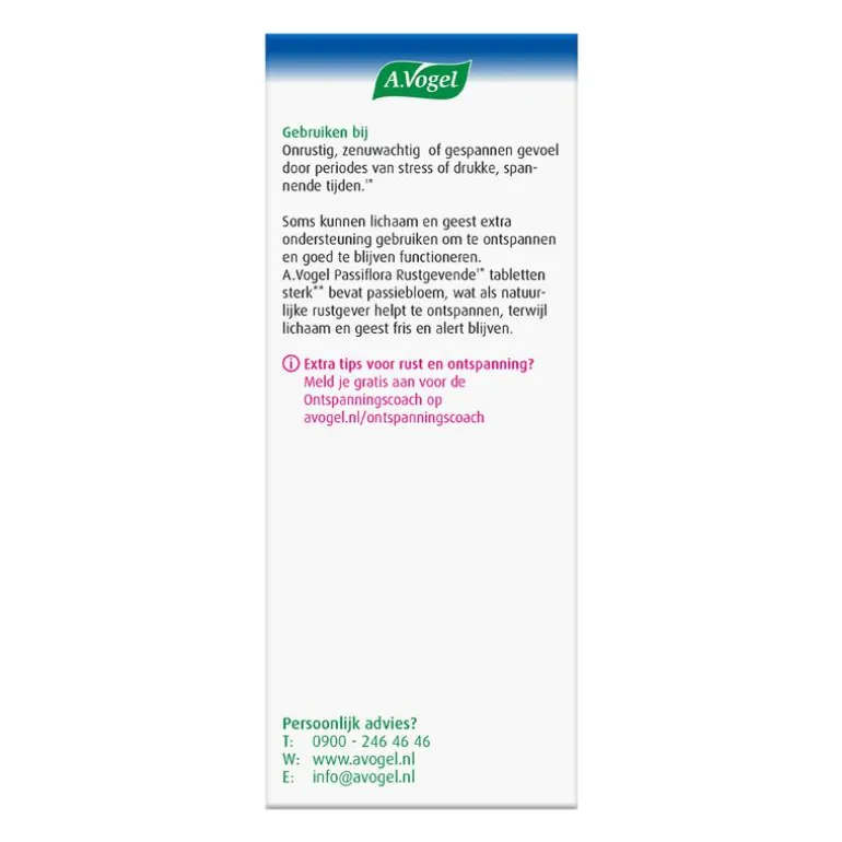 Niet altijd is het mogelijk om de oorzaak van je stress of spanning weg te nemen. Passiflora Rustgevende1* tabletten sterk** kan je dan helpen om er rustiger mee om te gaan1*. Het helpt snel***, maar houdt je lichaam en geest wel fris en alert. Goed om te weten is dat Passiflora Rustgevende1* tabletten sterk** geen gewenning geeft; je kunt op elk gewenst moment stoppen.