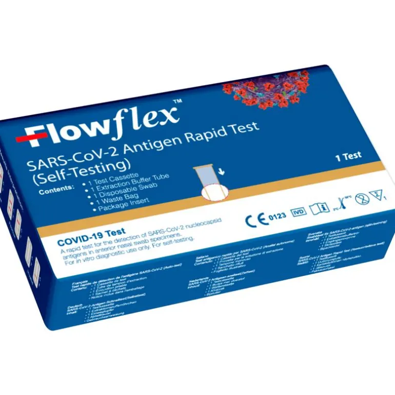 De snelle Acon Biotech Flowflex SARS-CoV-2 antigen test is een test voor de opsporing van het antigeen van SARS-CoV-2 in menselijke neusuitstrijkjes. Het neusuitstrijkje hoeft slechts 2,5 cm diep in de neusholte en de testresultaten kunnen na 15-30 minuten worden afgelezen.
