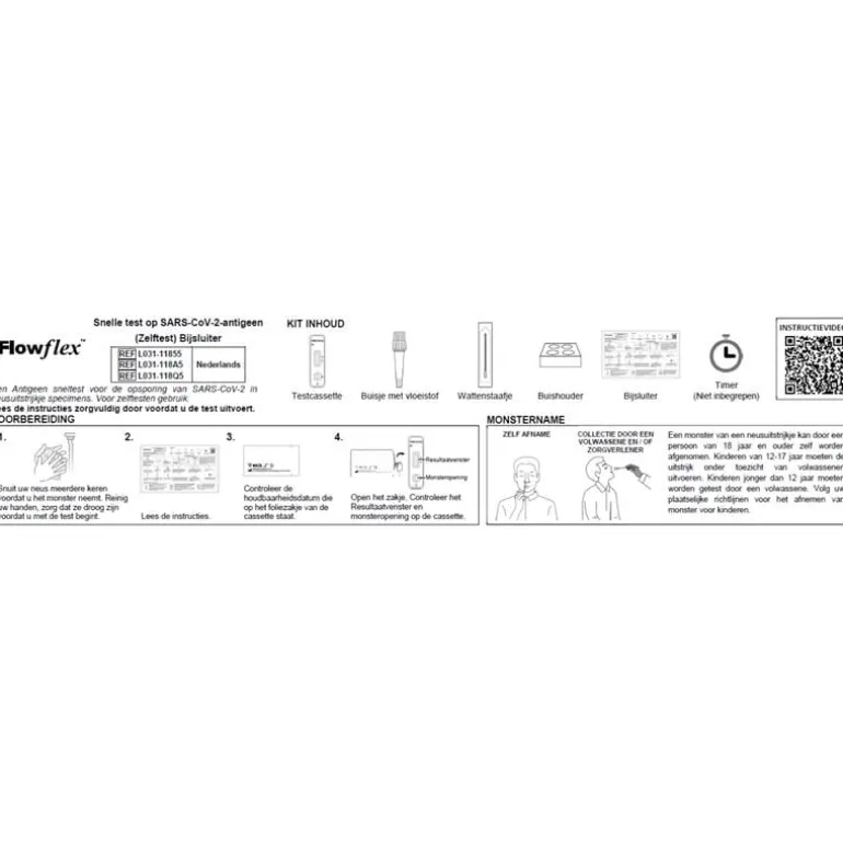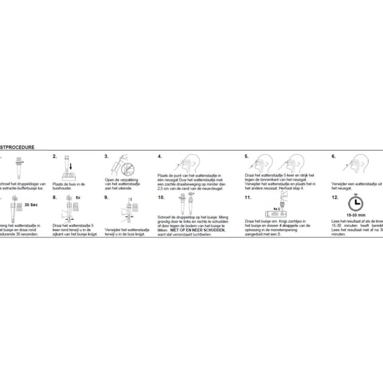 - Geen verdere instrumenten nodig, de testkit is klaar voor gebruik en bevat alle benodigdheden om een test zelf te kunnen uitvoeren