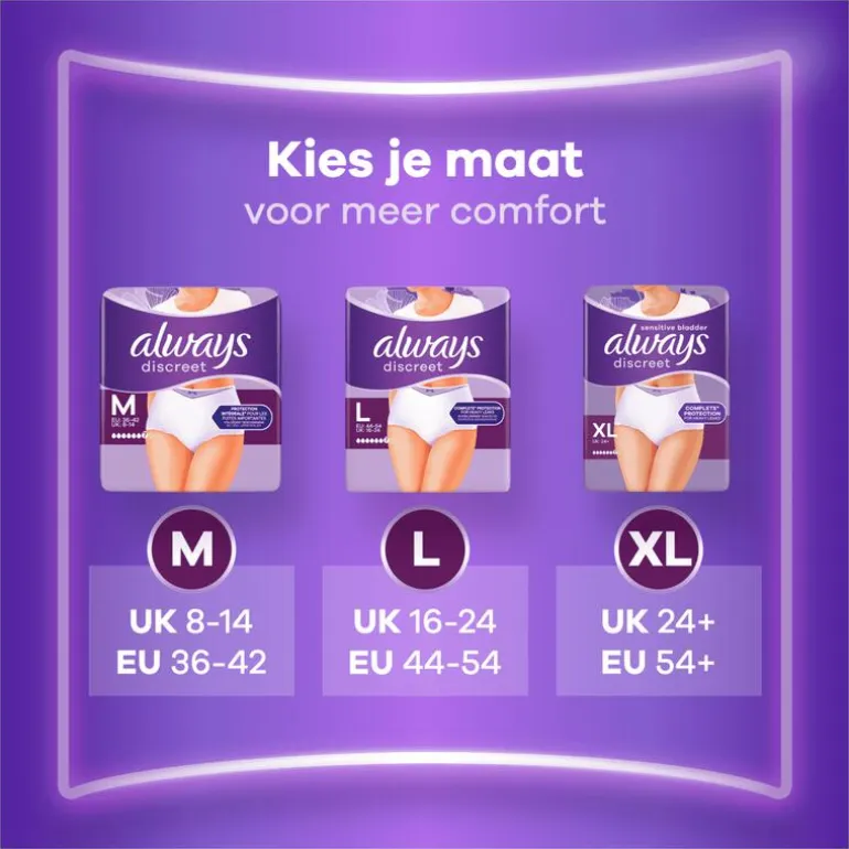 Laat incontinentie je er niet van weerhouden om actief te zijn. Met Always Discreet broekjes voor urineverlies Plus L kan jij volop van je dag genieten, zelfs bij veel urineverlies veroorzaakt door plotselinge aandrang. De superabsorberende broekjes zijn voorzien van RapidAbsorb technologie die urineverlies en geurtjes in enkele seconden helpt te absorberen en vast te houden. De dubbele LeakGuards beschermingsrandjes helpen lekken te vermijden daar waar ze het meeste voorkomen. Hun 360° FormFit-design en hun kern bieden een optimale en comfortabele pasvorm zodat je voluit van het leven kan genieten met een bescherming die je ongelooflijk goed past. Probeer Always Discreet broekjes voor urineverlies Plus L. Ook geschikt voor incontinentie na de bevalling. Ben je op zoek naar verschillende kleuren en optimale discretie? Kies dan Always Discreet Boutique broekjes, verkrijgbaar in zwart en beige.