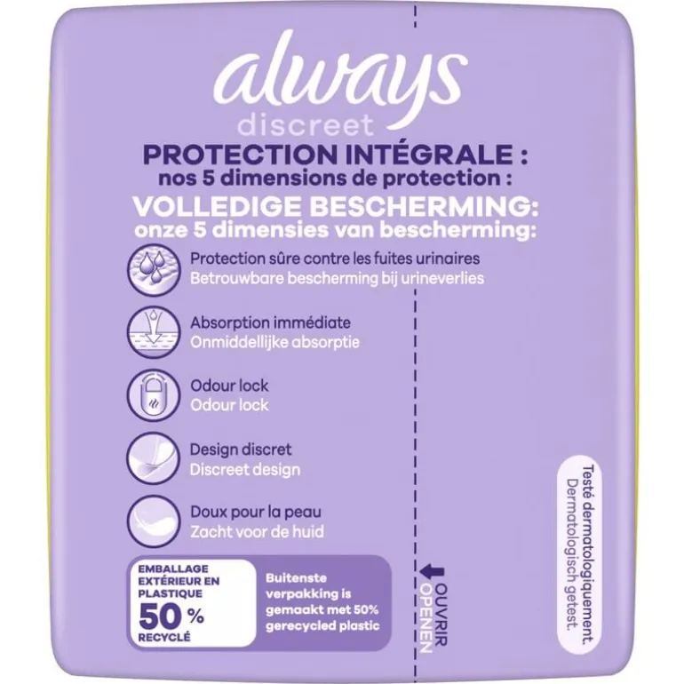 Ideaal voor veel urineverlies. Always Discreet verbanden voor urineverlies Long Plus bieden extra zekerheid. Ze zijn ontworpen om je extra bescherming en absorptie te bieden, zodat je je geen zorgen hoeft te maken over lekken. Hun structuur zorgt voor optimale bescherming dankzij hun ultradunne kern, zodat je niet hoeft te kiezen tussen comfort en bescherming. Always Discreet verband Long Plus biedt optimale bescherming wanneer niezen of lachen urineverlies veroorzaakt.
