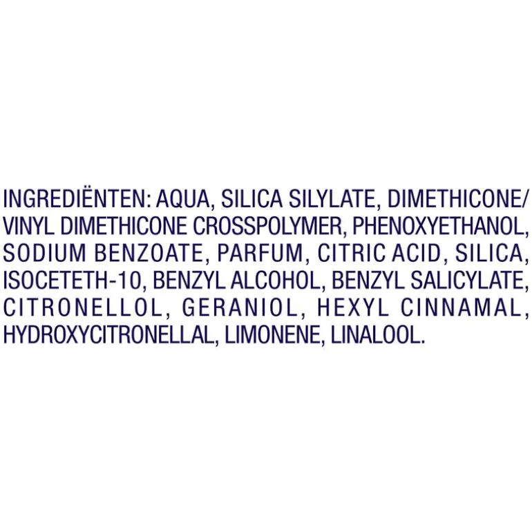 Aqua, Cetearyl Alcohol, Propylene Glycol, Cyclopentasiloxane, Hydroxypropyl Starch Phosphate, Behentrimonium Chloride, Disodium Edta, Ethylhexyl Dimethyl Paba, Hydroxyethylcellulose, Hydroxypropyl Cyclodextrin, Iodopropynyl Butylcarbamate, Panthenol, Parfum, Peg/ppg-18/18 Dimethicone, Phenoxyethanol, Phenyl Trimethicone, Triethanolamine, Vp/dmapa Acrylates Copolymer, Benzyl Alcohol, Benzyl Salicylate, Citronellol, Geraniol, Hexyl Cinnamal, Hydroxycitronellal, Limonene, Linalool.