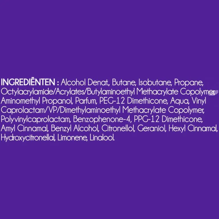 Alcohol Denat, Butane, Isobutane, Propane, Octylacrylamide/Acrylates/Butylaminoethyl Methacrylate Copaolymer, Aminomethyl Propanol, Parfum, PEG-12 Dimethicone, Aqua, Vinyl Caprolactam/VP/Dimethylaminoethyl Methacrylate Copolymer, Polyvinylcaprolactam, Benzophenone-4, PPG-12 Dimethicone, Amyl Cinnamal, Benzyl Alcohol, Citronellol, Ceraniol, Hexyl Cinnamal, Hydroxycitronellal, Limonene, Linalool.