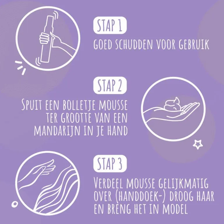 Hoe het product te gebruiken: de bus goed schudden voor gebruik. Houd de bus ondersteboven en spuit een bolletje mousse ter grootte van een mandarijn in je hand. Verdeel de mousse gelijkmatig over (handdoek-)droog haar en breng je haar in model. Föhnen versterkt het resultaat.