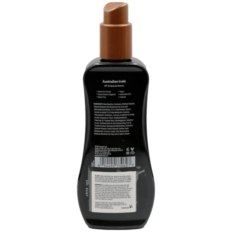 Alle Australian Gold SPF producten in de donkere flacons bevatten hoogwaardige natuurlijke bronzers. De Australian Gold ‘SPF 30 Spray Gel met bronzer’ zonnebrandspray beschermt perfect tegen UVA en UVB en trekt snel in. En dankzij de natuurlijke karamel bronzers word je ook nog eens een stuk sneller en dieper bruin. Bevat o.a. Aloë Vera, vitamine E, Australische Tea Tree olie en zonnebloemzaadextracten zodat je huid niet alleen goed beschermd is, maar ook nog eens uitstekend verzorgd wordt. Plakt niet, is niet vet, zweet- en waterbestendig. Flacons van 237 ml. En het ruikt ook zo lekker!