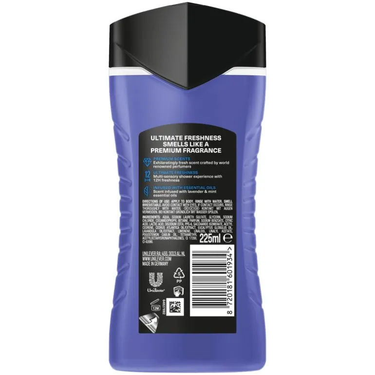 AXE Fine Fragrance Collection Blue Lavender Douchegel zorgt voor een verfrissende en relaxte verzorging en reiniging van je lichaam en laat je tot wel 12 uur lang onweerstaanbaar ruiken. Deze premium douchegel met de geur van lavendel, mint en amber ruikt als een luxe parfum! De frisse douchegel heeft een intense en langdurige geur, zo ruik je nog langer fris na het douchen. AXE Fine Fragrance Collection Blue Lavender Douchegel is een van de premium geuren uit onze AXE Fine Fragrance Collection-lijn. Dit assortiment met natuurlijke essentiële oliën is gecreëerd door meesterparfumeurs. Met deze premium geuren ruik je net zo onweerstaanbaar als met een luxe parfum. Geniet je van deze geur? Probeer dan ook eens de AXE Fine Fragrance Collection Blue Lavender Deodorant Bodyspray.