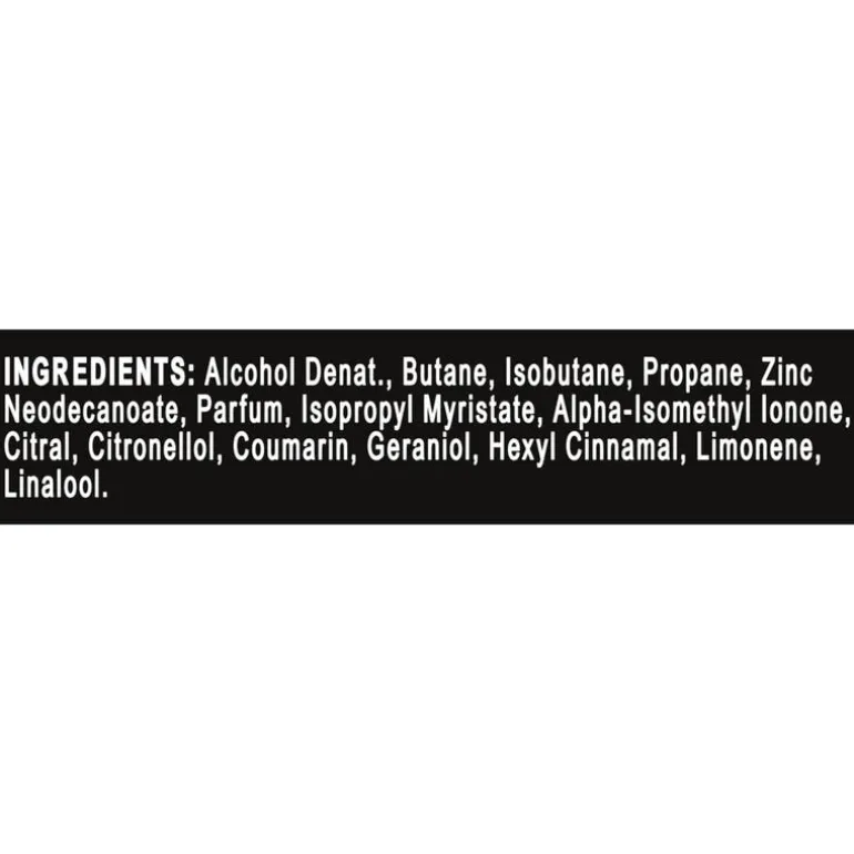Alcohol Denat., Butane, Isobutane, Propane, Zinc Neodecanoate, Parfum, Isopropyl Myristate, Acetyl Cedrene, Alpha-Isomethyl Ionone, Alpha-Terpinene, Beta-Caryophyllene, Camphor, Citral, Citronellol, Citrus Aurantium Bergamia Peel Oil, Citrus Aurantium Peel Oil, Citrus Limon Peel Oil, Coumarin, Eucalyptus Globulus Oil, Geraniol, Geranyl Acetate, Hexyl Cinnamal, Lavandula Oil/Extract, Limonene, Linalool, Linalyl Acetate, Menthol, Pelargonium Graveolens Flower Oil, Pinene, Terpineol, Terpinolene, Tetramethyl Acetyloctahydronaphthalenes.