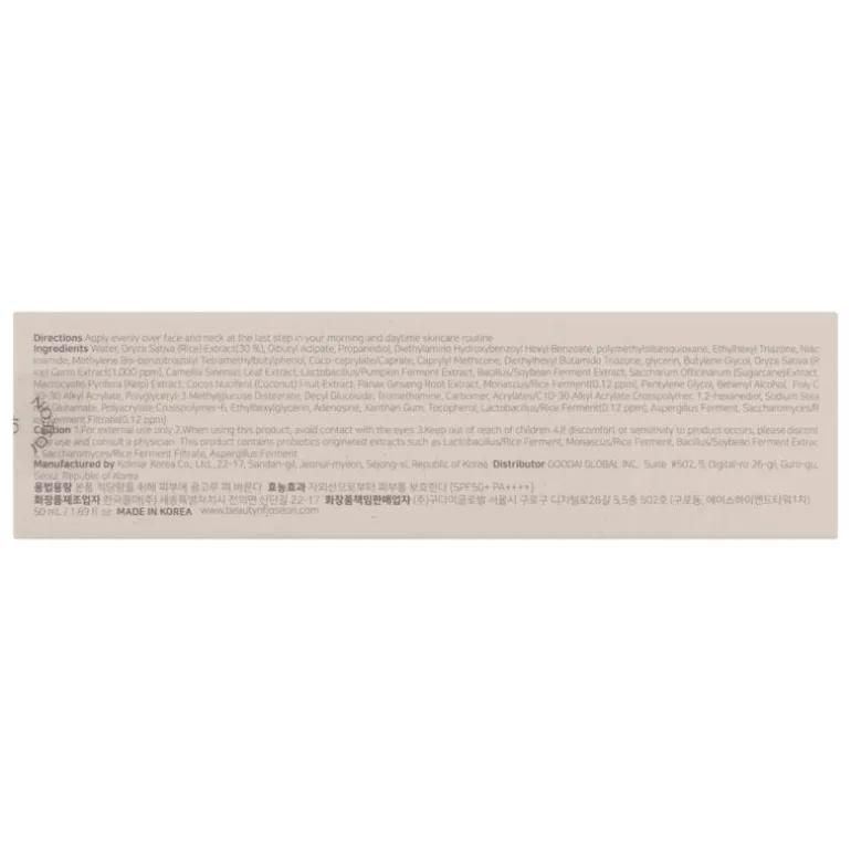Water, Oryza Sativa (Rice) Extract (30%), Dibutyl Adipate, Propanediol, Diethylamino Hydroxybenzoyl Hexyl Benzoate, Polymethylsilsesquioxane, Ethylhexyl Triazone, Niacinamide, Methylene Bis-benzotriazolyl Tetramethylbutylphenol, Coco-caprylate/Caprate, Caprylyl Methicone, Diethylhexyl Butamido Triazone, Glycerin, Butylene Glycol, Oryza Sativa (Rice) Germ Extract, Camellia Sinensis Leaf Extract, Lactobacillus/Pumpkin Ferment Extract, Bacillus/Soybean Ferment Extract, Saccharum Officinarum (Sugarcane) Extract, Macrocystis Pyrifera (Kelp) Extract, Cocos Nucifera (Coconut) Fruit Extract, Panax Ginseng Root Extract, Camellia Sinensis Leaf Extract, Monascus/Rice Ferment, Pentylene Glycol, Behenyl Alcohol, Poly C10-30 Alkyl Acrylate, Polyglyceryl-3 Methylglucose Distearate, Decyl Glucoside, Tromethamine, Carbomer, Acrylates/C10-30 Alkyl Acrylate Crosspolymer, 1,2-Hexanediol,Sodium Stearoyl Glutamate, Polyacrylate Crosspolymer-6, Ethylhexylglycerin, Adenosine, Xanthan Gum, Tocopherol, Lactobacillus/Rice Ferment, Aspergillus Ferment, Saccharomyces/Rice Ferment Filtrate.
