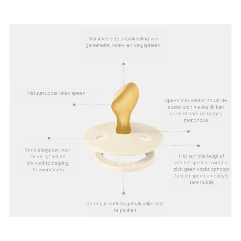 • Natuurrubber latex is extra zacht en heeft daardoor minder impact op de (doorkomende) tandjes (rubber is een natuurlijk materiaal en daarom kunnen er lichte kleurafwijkingen optreden.)