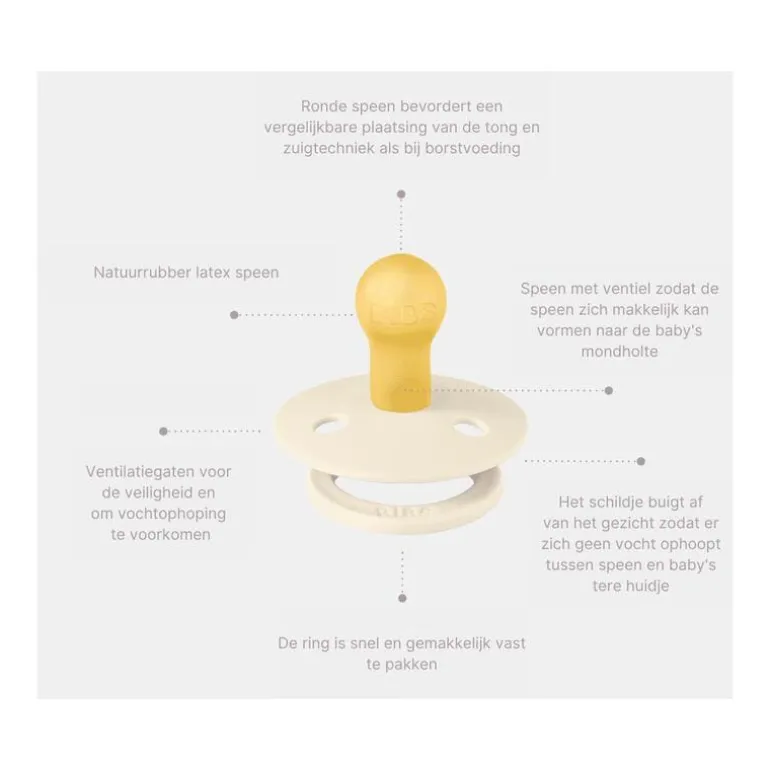 • De speen is gemaakt van natuurlijk rubberlatex. Latex neemt sneller de temperatuur aan van de mondje van de baby en voelt extra zacht aan waardoor het een hoog acceptatie gehalte heeft