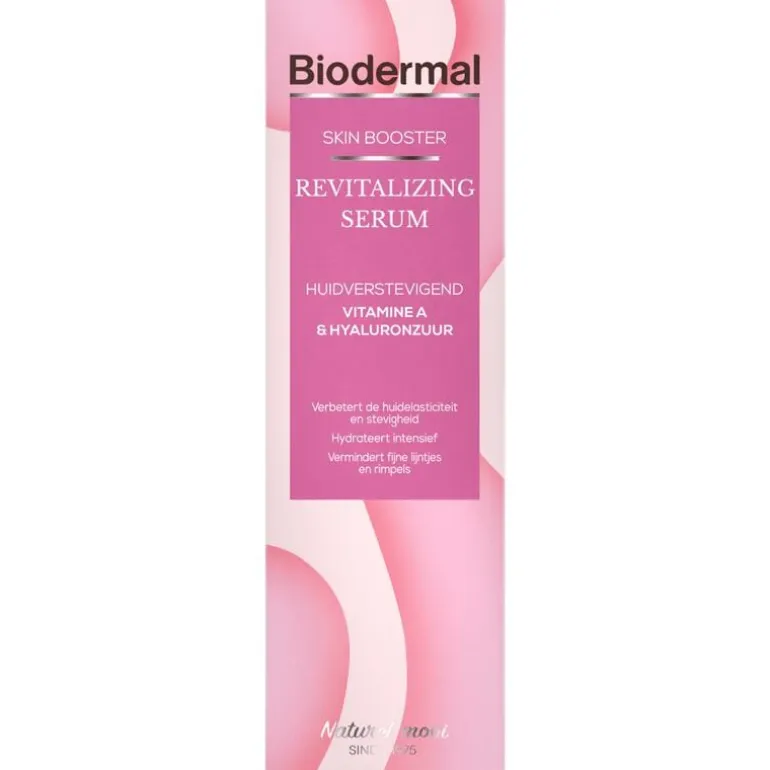Nieuw van Biodermal: Biodermal Skin Booster Revitalizing Serum. Het Revitalizing Serum is een krachtige en hoog geconcentreerde skin boosterformule. De combinatie van vitamine A en hyaluronzuur werkt huidverstevigend en gaat op effectieve wijze tekenen van huidveroudering tegen. Fijne lijntjes en rimpels worden zichtbaar vermindert en de huid wordt intensief gehydrateert. De parfumvrije, lichte textuur wordt gemakkelijk door de huid opgenomen en vormt een ideale basis voor de dag- of nachtverzorging. Geschikt voor alle huidtypen. Deze serum past bij alle gezichtsverzorging en zorgt ervoor dat ze net iets harder werken