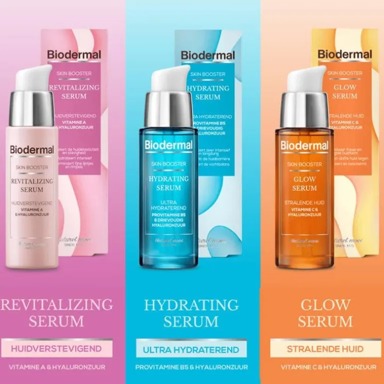 - Biodermal Skin Booster Hydrating Serum: Serum met drievoudige hyaluronzuur en pro vitamine B5. Hydrateert zeer intensief en verstevigd de huid barrière
