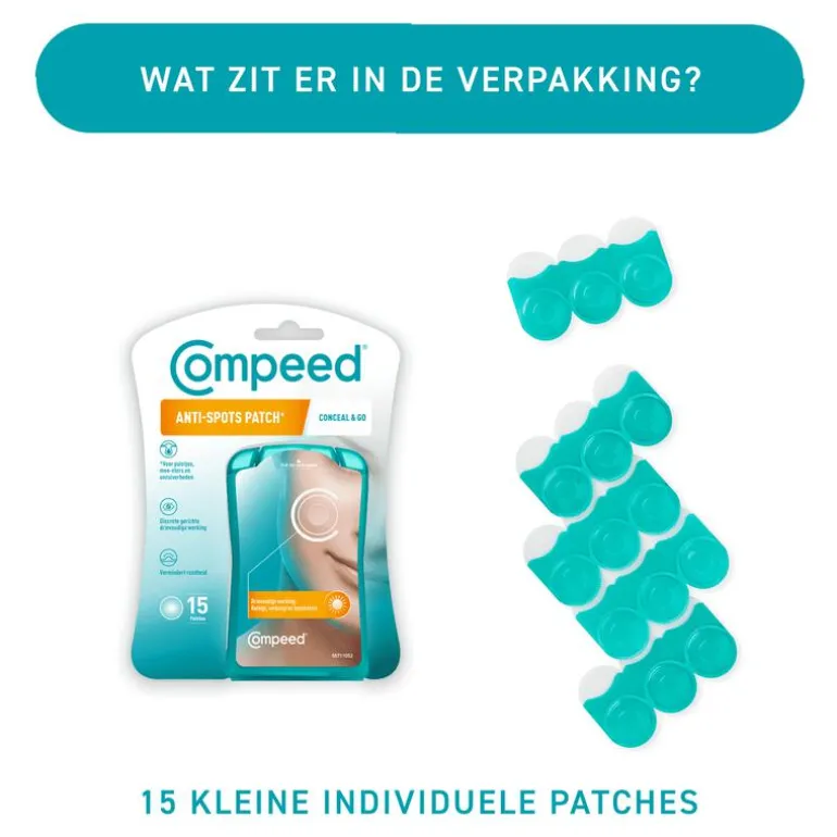De onopvallende patch reinigt de poriën, verbergt kleine puistjes en rode plekjes en beschermt tegen aanraken en vuil van buitenaf. Compeed Anti-Spots Conceal & Go bevat hydrocolloïd om een optimale genezingsomgeving voor de huid te creëren.