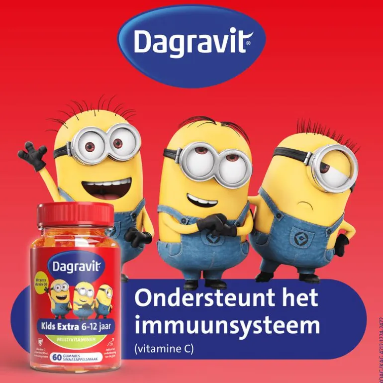 Gebruiksaanwijzing en aanbevolen gebruik per dag: Kinderen vanaf 6 jaar dagelijks 1 – 2 gummies. Bij voorkeur innemen tijdens de maaltijd. De aanbevolen dagelijkse dosering niet overschrijden. Dit voedingssupplement is niet geschikt voor kinderen onder de 3 jaar. Een gevarieerde, evenwichtige voeding en een gezonde levensstijl zijn belangrijk. Voedingssupplementen zijn geen vervanging van gevarieerde voeding.Dagravit Kids-Xtra VitaMinions Gummies bevat geen kunstmatige kleur- en smaakstoffen.