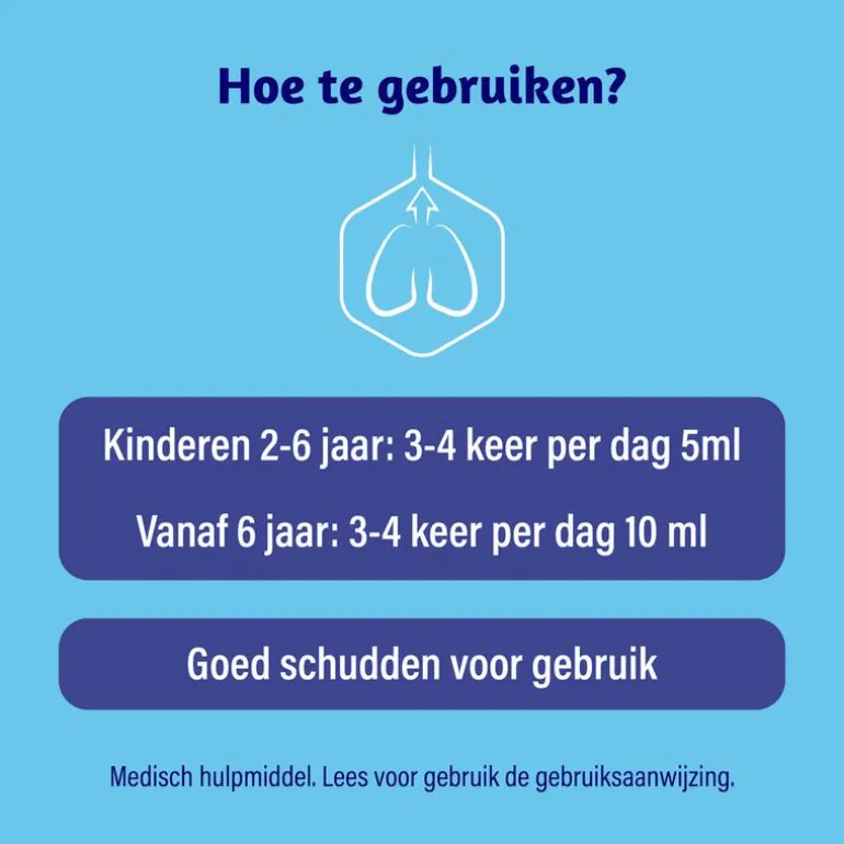 Dosering; * Kinderen van 2-6 jaar: 3-4 keer per dag 5ml * Vanaf 6 jaar en volwassenen: 3-4 keer per dag 10 ml. Goed schudden voor gebruik en lees voor gebruik de gebruiksaanwijzing.Te gebruiken voor kinderen vanaf 2 jaar onder toezicht van volwassenen. Alleen voor oraal gebruik. Niet gebruiken bij overgevoeligheid voor één van de ingrediënten. Niet geschikt voor diabetici. Raadpleeg voor gebruik eerst de huisarts tijdens zwangerschap en borstvoeding.