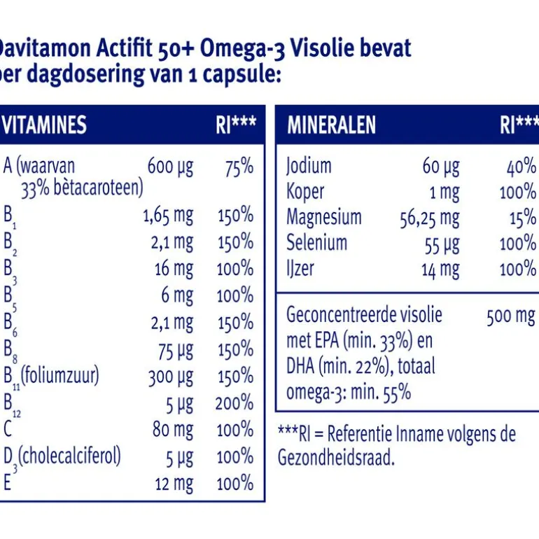 Davitamon Actifit 50+ Omega-3 Visolie is speciaal ontwikkeld voor volwassenen vanaf 50 jaar en voorziet in de dagelijkse aanvulling van vitamines en mineralen. Hierdoor is Davitamon Actifit 50+ Omega-3: