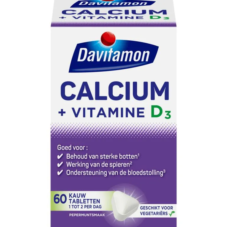 Davitamon Calcium met Vitamine D is een voedingssupplement dat speciaal is ontwikkeld voor volwassenen die behoeften hebben aan extra Calcium en vitamine D. Calcium is nodig voor het behoud van sterke botten en speelt een rol bij het behouden van soepele spieren. Davitamon Calcium kauwtabletten met Vitamine D, 100% van de ADH, zijn:
