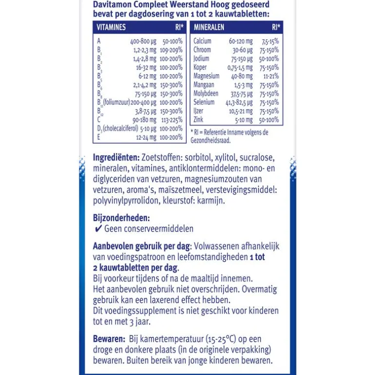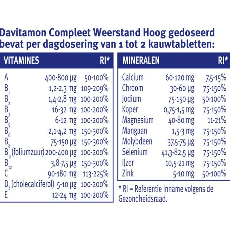 Davitamon Compleet Weerstand Forte Kauwtabletten zijn speciaal ontwikkeld voor volwassenen en hebben een lekkere bosvruchtensmaak. De kauwvitamines bevatten een extra hoge dosering van belangrijke vitamines (min. 200% van de ADH) en mineralen (min. 150% van de ADH) en is daarom: