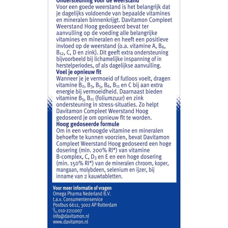 Wanneer je je vermoeid of futloos voelt dragen vitamine B2, B3,B5, B6, B11 en C bij aan extra energie bij. Daarnaast bieden vitamine B11 (foliumzuur) en zink ondersteuning in stress-situaties. Davitamon Compleet Weerstand Forte kauwvitamines bevat een extra hoge dosering van deze vitaminen en mineralen. Zo helpt Davitamon Compleet Weerstand Forte je om opnieuw fit te worden.