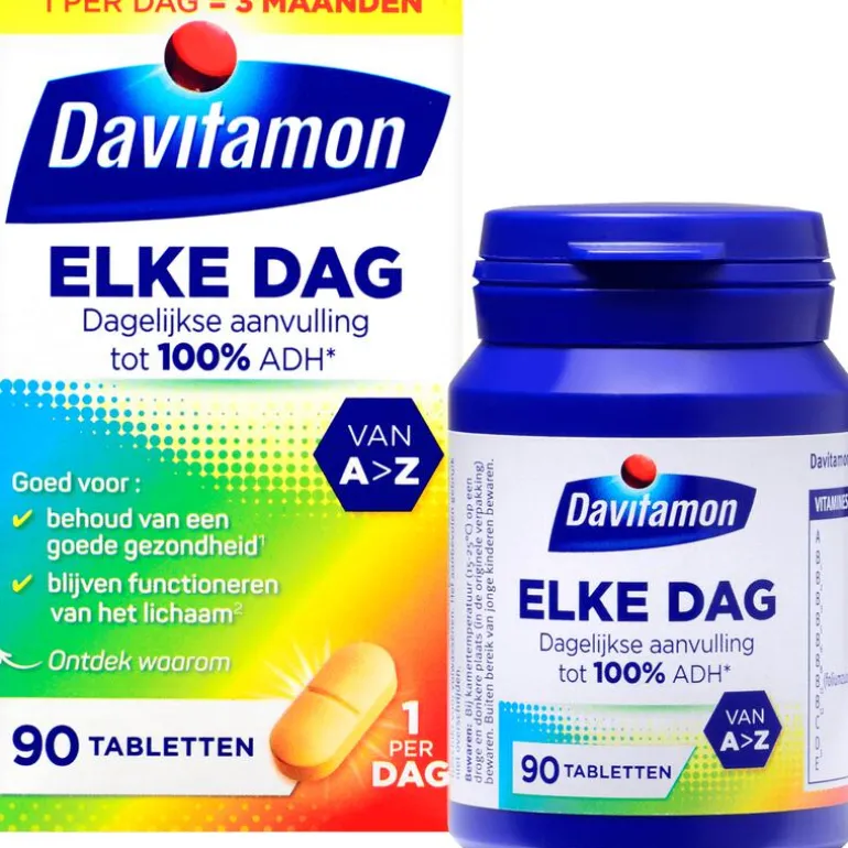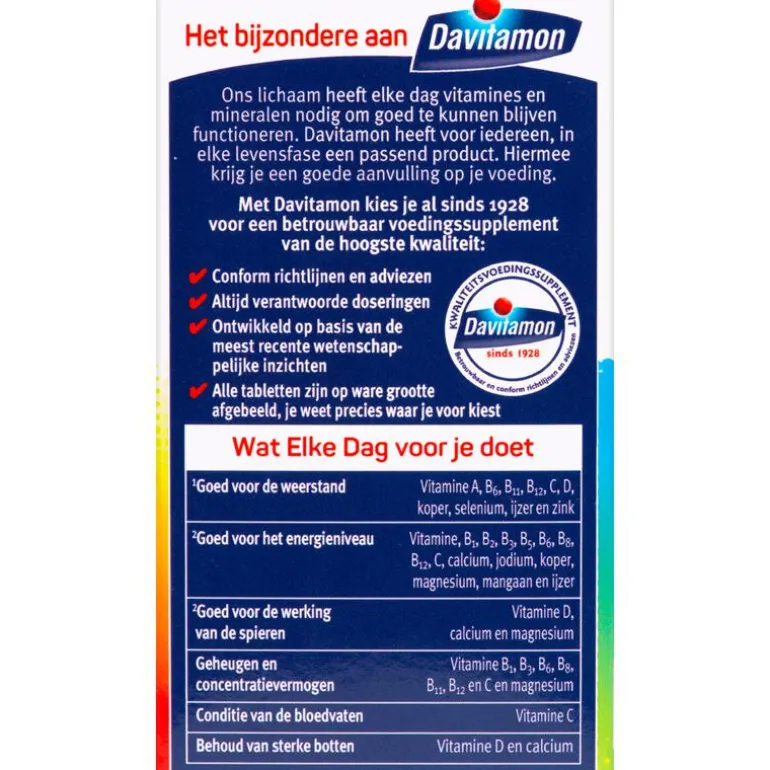 Davitamon Elke Dag is een complete multivitamine voor zowel mannen als vrouwen. Het helpt je 365 dagen per jaar een goede gezondheid in stand te houden. Davitamon Elke Dag is een aanvulling op de vitaminen en mineralen die je lichaam dagelijks nodig heeft en is daarom: