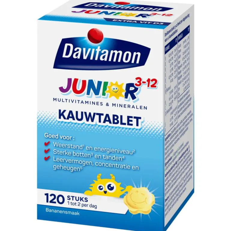 Davitamon Junior 3-12 Kauwvitamines Banaan is afgestemd op de specifieke behoeften van kinderen vanaf 3 jaar. Omdat groeien niet vanzelf gaat, is het belangrijk dat kinderen voldoende vitamines en mineralen binnen krijgen. Een voedingssupplement kan hierbij helpen. Davitamon Junior KauwVitamines Banaan bevat veel vitamine D3, 100% van de ADH, en is hierdoor: