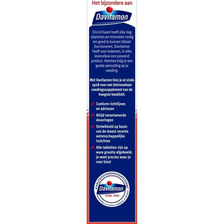 Om goed te kunnen blijven functioneren heeft ons lichaam elke dag vitamines en mineralen nodig. Daarom heeft Davitamon voor iedereen, in elke levensfase, een ander product. Zo krijg jij de juiste aanvulling op je voeding. Davitamon biedt al sinds 1928 betrouwbare voedingssupplementen aan van de hoogste kwaliteit.