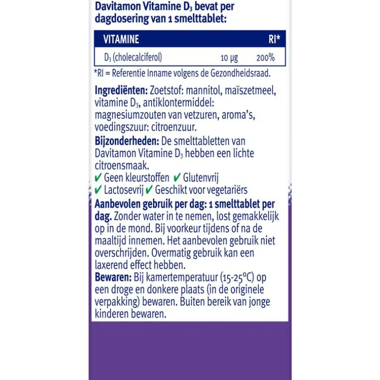 Davitamon Vitamine D Smelttabletten zijn speciaal ontwikkeld voor volwassenen en voorzien in een verhoogde behoefte aan vitamine D (200% van de ADH). Vitamine D speelt een essentiële rol speelt bij verschillende lichaamsfuncties, zo is Davitamon met vitamine D: