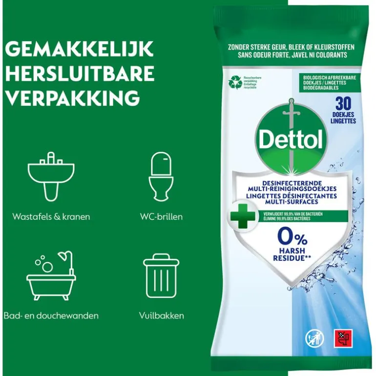 Dettol Desinfecterende Multi-reinigingsdoekjes verwijderen 99,9% van de bacteriën. Daarnaast verwijderen ze pollen, huisdierschilfers, en allergenen die door huistofmijt worden meegebracht. Ze reinigen elk oppervlak in een handomdraai en zijn praktisch, veilig en effectief. Ze zijn zuiverend, zonder bleek- of kleurstoffen en biologisch afbreekbaar. De verpakking is gemakkelijk hersluitbaar en voorkomt uitdroging.