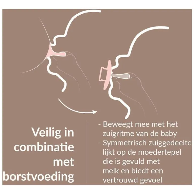 - Symmetrische vorm imiteert de moedertepel waardoor de fopspeen makkelijk geaccepteerd wordt vanaf de geboort