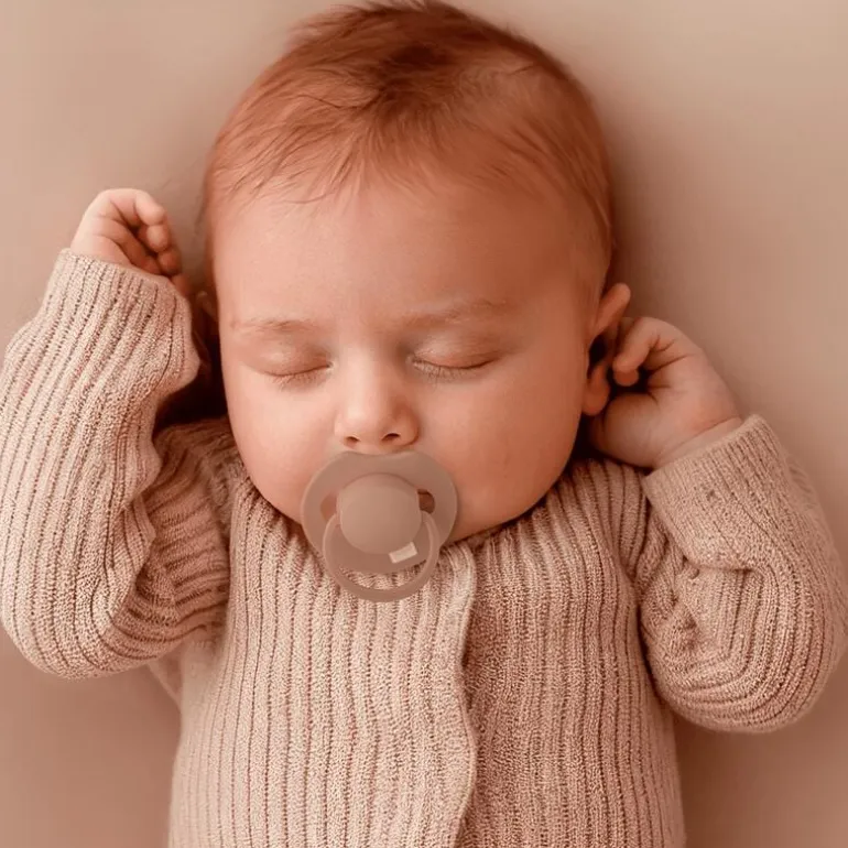De speen is gemaakt van zacht en BPA-vrij siliconen en voelt comfortabel aan in het mondje. Dankzij de ventilatiegaatjes in het schildje krijgt de huid rondom de mond voldoende lucht, waardoor huidirritatie wordt voorkomen. Het rustige kleurontwerp in Nude/Blush past perfect bij elke stijl.