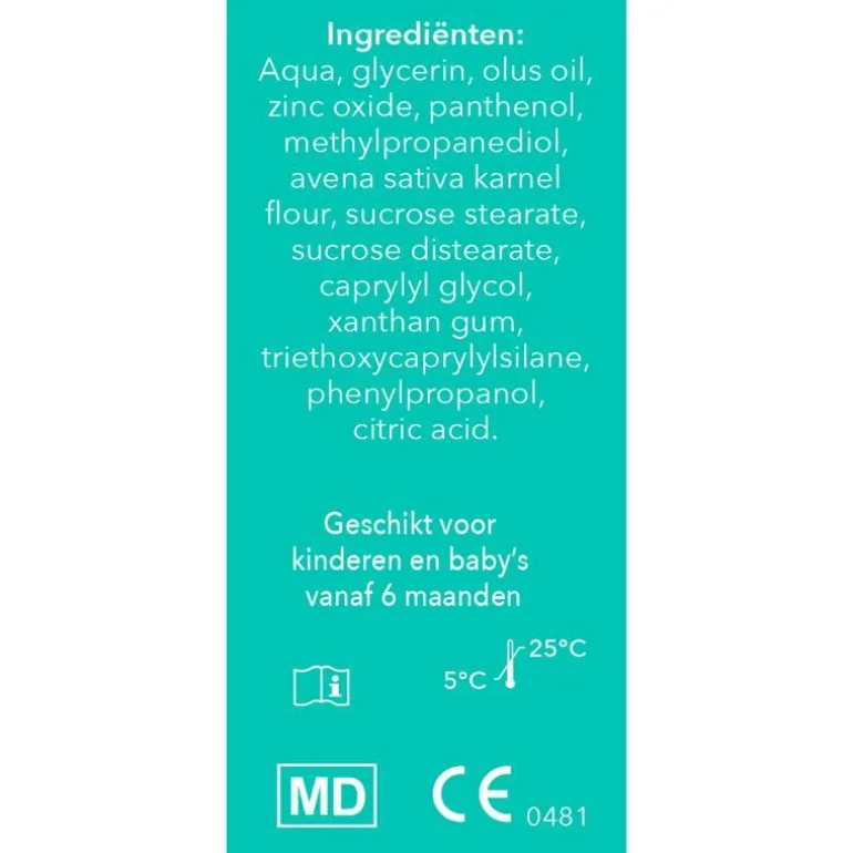 Aqua, glycerin, olus oil, zinc oxide, panthenol, methylpropanediol, avena sativa karnel flour, sucrose stearate, sucrose distearate, caprylyl glycol, xanthan gum, triethoxycaprylylsilane, phenylpropanol, citric acid. 100% ‘plantaardige vaseline’: De duurzame keuze voor langdurige hydratatie. Colloidaal havermout: Vormt een beschermende barrière op de huid