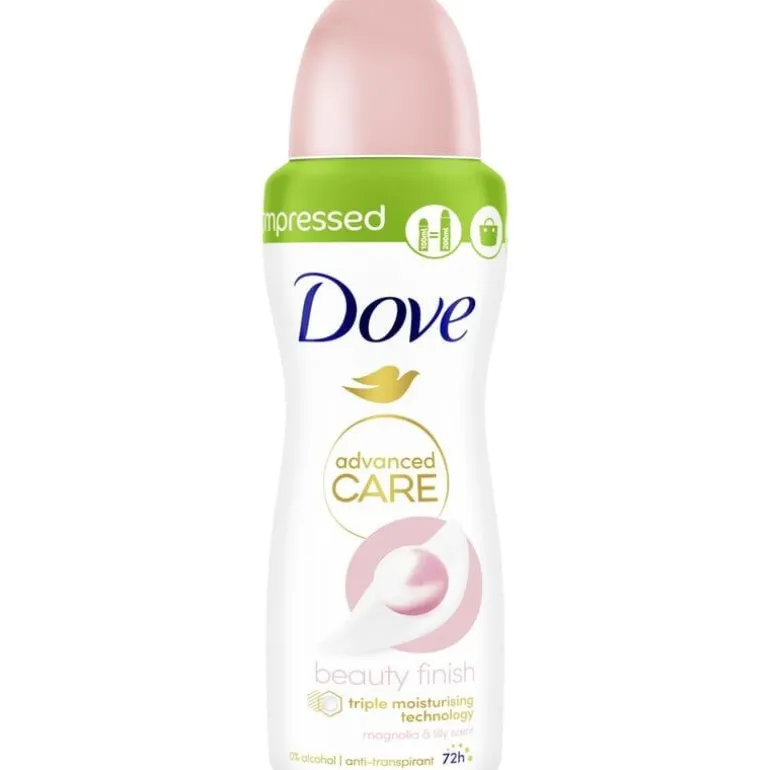 Dove Advanced Care Beauty Finish Magnolia & Lilly Anti-Transpirant Deodorant Spray met beautymineralen die het licht weerkaatsen en de huid doen stralen, verzorgt en hydrateert de huiden biedt tot wel 72 uur bescherming tegen zweet. Deze anti-transpirant bevat beautymineralen die het licht weerkaatsen en je okselhuid laten stralen als nooit tevoren. Een klassieker voor een instant mooiere huid, met de heerlijke geur van magnolia en lelie. De Dove Advanced Care anti-transpiranten maken deel uit van de meest verzorgende lijn van Dove, met de verbeterde gepatenteerde formule zijn ze zacht voor de huid. Het Advanced Care assortiment van Dove biedt met de Triple Moisturising technologie tot 72 uur bescherming tegen zweet. De hele dag een fris en verzorgd gevoel – wat de dag je ook brengt! Deze deodorant spray helpt om je gevoelige huid te herstellen van irritatie veroorzaakt door het scheren. De compressed spuitbus van 100 ml gaat even lang mee als de gewone versie van 200 ml, bovendien zorgt onze compressed technologie dat onze deodorants hun gas langzamer afgeven, zodat hij ook milder is voor de huid.