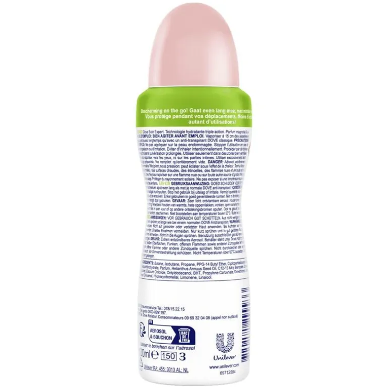 Dove ondersteunt vrouwen wereldwijd bij het realiseren van hun volledige potentiële en individuele schoonheid door verzorgingsproducten te ontwikkelen die inspelen op de persoonlijke behoeften van hun huid en haar. Want wij geloven dat wie zich mooi en lekker in zijn vel voelt met de hulp van de juiste verzorging, dat ook kan uitstralen. Om de impact op het mileu te verminderen hebben de Dove anti-transpiranten en deodoranten een andere verpakking gekregen. De aluminium spuitbus van deze anti-transpirant is 100% en oneindig recyclebaar. Deze compressed deodrorant gaat ook even lang mee als de gewone variant en verlaagt zo de impact op het milieu. De Dove anti-transpirant deodorants zijn vegan en dragen het PETA-approved keurmerk.
