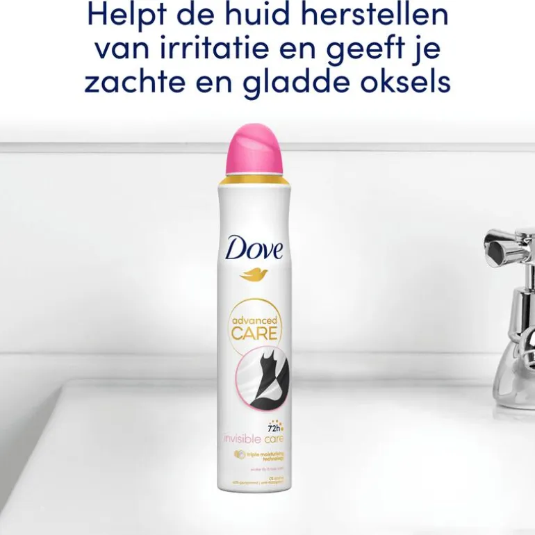 DOVE ADVANCED CARE INVISIBLE CARE ANTI-TRANSPIRANT DEODORANT SPRAY HEEFT EEN HEERLIJKE GEUR VAN WATERLELIE EN ROZEN EN BESCHERMT ZOWEL JE OKSELS ALS JE KLEDING.