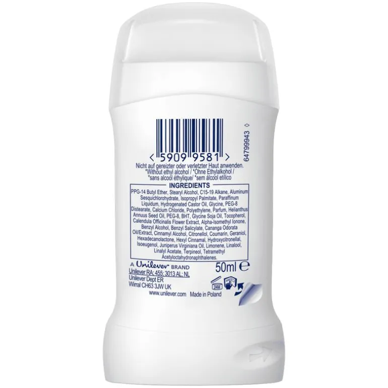 PPG-14 Butyl Ether, Stearyl Alcohol, C15-19 Alkane, Aluminum Sesquichlorohydrate, Isopropyl Palmitate, Paraffinum Liquidum, Hydrogenated Castor Oil, Glycine, PEG-8 Distearate, Calcium Chloride, Polyethylene, Parfum, Helianthus Annuus Seed Oil, PEG-8, BHT, Glycine Soja Oil, Tocopherol, Calendula Officinalis Flower Extract, Alpha-Isomethyl Ionone, Benzyl Alcohol, Benzyl Salicylate, Cananga Odorata Oil/Extract, Cinnamyl Alcohol, Citronellol, Coumarin, Geraniol, Hexadecanolactone, Hexyl Cinnamal, Hydroxycitronellal, Isoeugenol, Juniperus Virginiana Oil, Limonene, Linalool, Linalyl Acetate, Terpineol, Tetramethyl Acetyloctahydronaphthalenes.