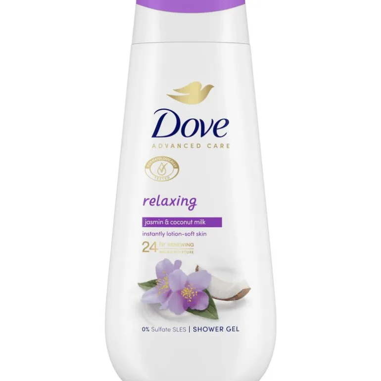 Gebruik Dove Advanced Care Relaxing Verzorgende Douchegel, met de geur van jasmijn en kokosmelk, voor een zachte huid al na één keer douchen.