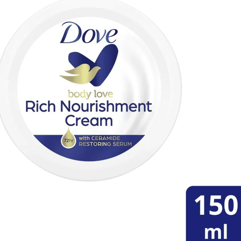 DOVE BODY LOVE RICH NOURISHMENT BODYCRÈME VOOR EEN GEVOEDE EN GEHYDRATEERDE HUID.• Dove Body Love Rich Nourishment Bodycrème voedt en hydrateert de huid• De bodycrème trekt snel in en geeft je huid tot 72 uur hydratatie• Deze crème bevat het unieke Ceramide Restoring Serum• Helpt de barrière van de huid te versterken om zo vochtverlies te voorkomen• De voedende crème is romig en dik waardoor hij optimaal hydrateert• De crème is dermatologisch getest en is geschikt voor alle huidtypen