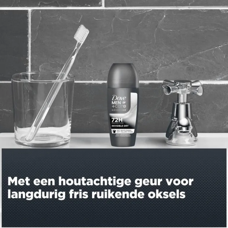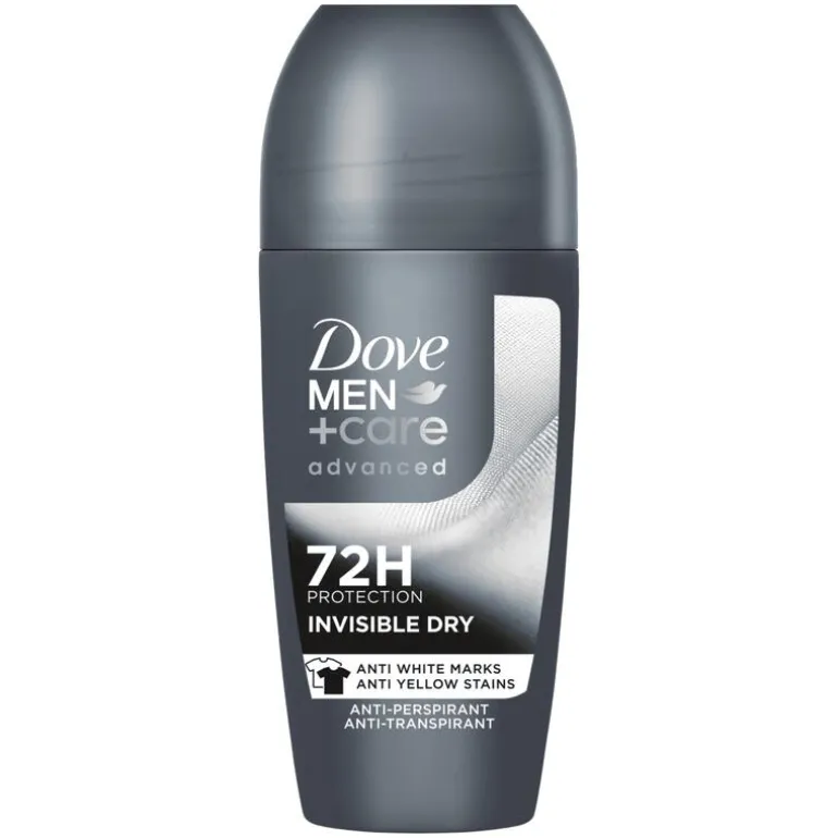 Dove Men+Care Advanced Invisible Dry Anti-Transpirant Deodorant Roller beschermt tot 72 uur tegen zweet, nare geurtjes en tegen witte strepen en gele vlekken.