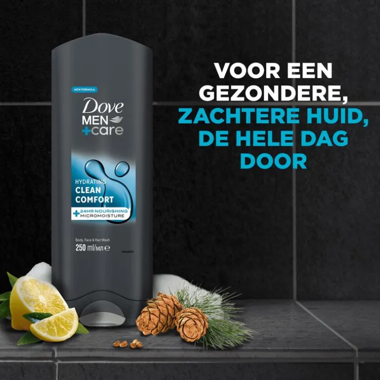DOVE MEN+CARE CLEAN COMFORT 3-IN-1 VERZORGENDE DOUCHEGEL MET DE FRISSE GEUR VAN CITRUS EN CEDERHOUT EN 24H MICROMOISTURE TECHNOLOGIE VOOR EXTRA HYDRATATIE IS SPECIAAL ONTWORPEN VOOR MANNEN.• Dove Men+Care Clean Comfort 3-in-1 Verzorgende Douchegel voor mannen• 24H MicroMoisture technologie voor verzorging en hydratatie van de huid• Hydraterende bodywash met de frisse geur van citrus en cederhout• Dermatologisch geteste bodywash, geschikt voor lichaam, haar en gezicht• Een verbeterde formule met 3 keer meer huidversterkende voedingsstoffen• De fles van deze douchegel is gemaakt van 100% gerecycled plastic*