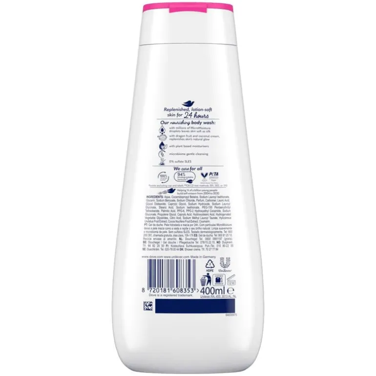 Dove Advanced Care Replenishing Douchegel verandert je dagelijkse douche- of badroutine in een echt verwenmomentje. Dove Replenishing Douchegel heeft een lichte geltextuur en is verrijkt met huidverzorgende voedende bestanddelen. De bodywash reinigt op milde wijze, hydrateert je huid en helpt om haar natuurlijke glans te herstellen met vitaminerijk dragonfruit en voedende kokoscrème. De douchegel bevat de 24-uur vernieuwende MicroMoisture-formule voor een 24 uur lang gehydrateerde, zijdezachte huid. Deze voedende douchegel is gemaakt met natuurlijke milde reinigers en plantaardige moisturisers en is zacht voor het microbioom. De douchegel bevat geen sulfaatreinigers, is voor 94% biologisch afbreekbaar* en is verpakt in 100% gerecyclede plastic flessen**. Dove Replenishing Douchegel heeft een veganistische formule en is door PETA gecertificeerd als ‘vegan’. *94% van de ingrediënten breekt af in kooldioxide, water en mineralen (OESO-testmethoden 301, 302, 310). **M.u.v. de dop en labels.