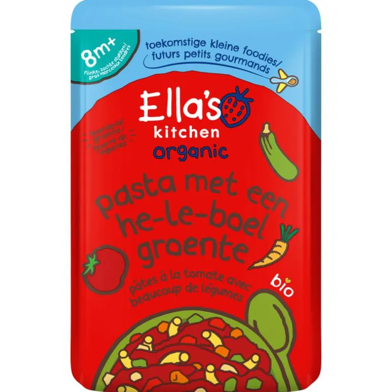 Ik ben een biologisch babyvoedings-maaltijdje met pasta, tomaat + groente.