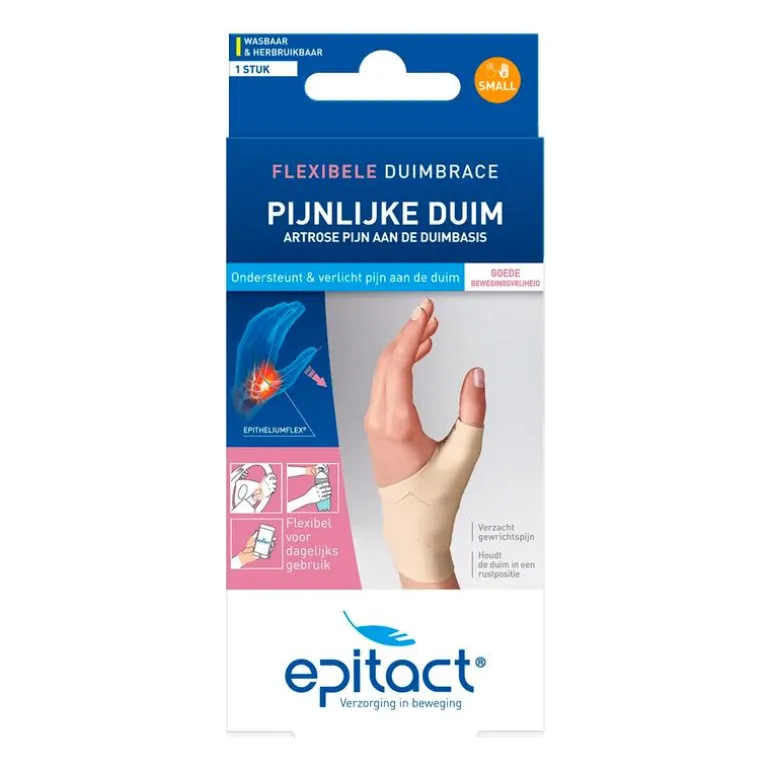 Epitact Duim Orthese Dag Links Small voorkomt, ondersteunt en verlicht pijn aan de duim. Met deze flexibele duimbrace wordt je duim in een rustpositie gehouden zonder de bewegingsvrijheid te beperken. Epitact Duim Orthese Overdag Links Small verzacht onmiddellijk gewrichtspijn en is geschikt voor dagelijks gebruik.