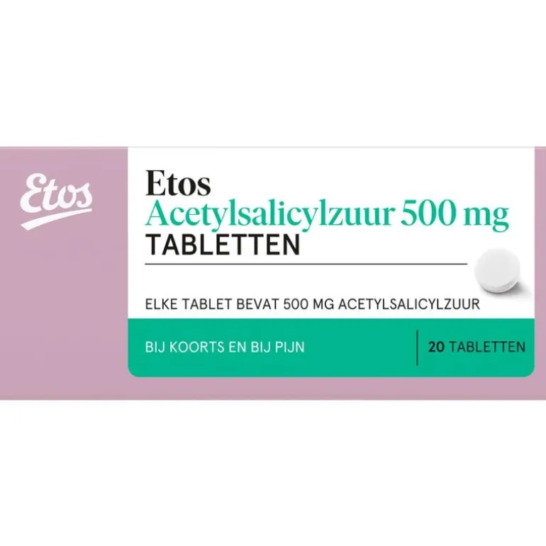 Etos Acetylsalicylzuur 500mg is een geneesmiddel dat wordt gebruikt bij lichte tot matige pijn en/of koorts. Elke tablet bevat 500 mg acetylsalicylzuur. De tabletten zijn bedoeld voor oraal gebruik en worden bij voorkeur ingenomen na een maaltijd, met een ruime hoeveelheid water.
