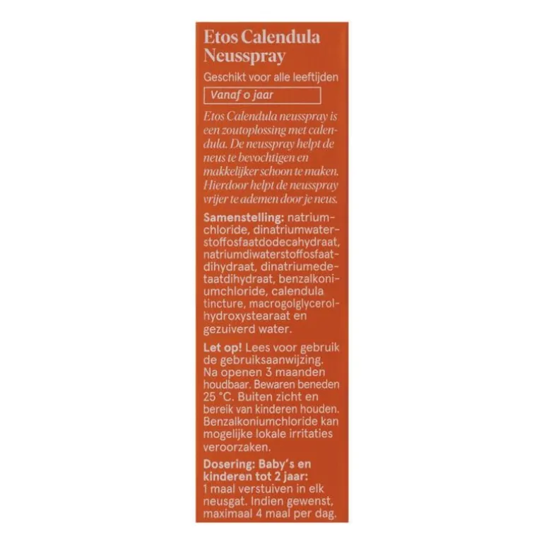Etos Calendula Neusspray is een isotone oplossing, met een zoutgehalte dat geschikt is om het neusvlies te reinigen.Etos Calendula Neusspray kan worden gebruikt om: • De neus te bevochtigen wanneer ze droog is bij geringe luchtvochtigheid (bijvoorbeeld in verwarmde ruimtes of ruimtes met airconditioning, bij grote hoogte, vliegreizen). • Het neusslijmvlies zachtjes te reinigen zodat de baby of het kind vrijer kan ademen.