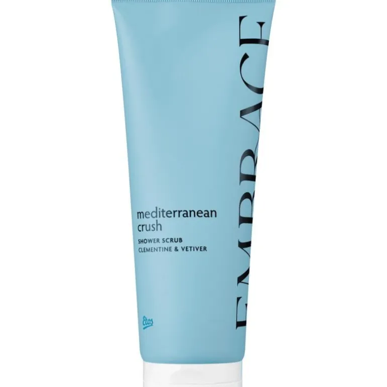 Etos Embrace Shower Scrub Mediterranean Crush is een exfoliërende douchescrub met kokosnootolie en natuurlijke abrikoos en kokosnoot scrubdeeltjes.