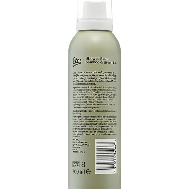 Etos Shower foam bamboo & green tea is verrijkt met groene thee extract en bamboe extract en heeft een fris parfum. De formule is