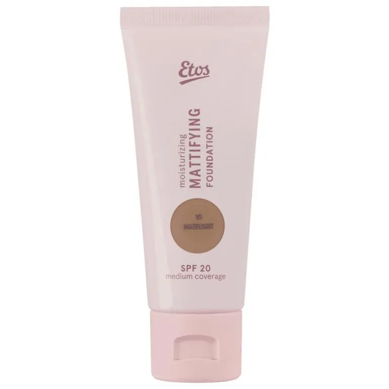 De Etos Moisturizing Mattifying Foundation SPF 20 in 10 Hazelnut is ideaal voor een medium tot donkere huid met een warme ondertoon. Deze foundation biedt een matte finish die de hele dag blijft zitten en helpt bij het minimaliseren van poriën. Met een medium dekking zorgt het voor een egale teint en een verfijnde uitstraling.