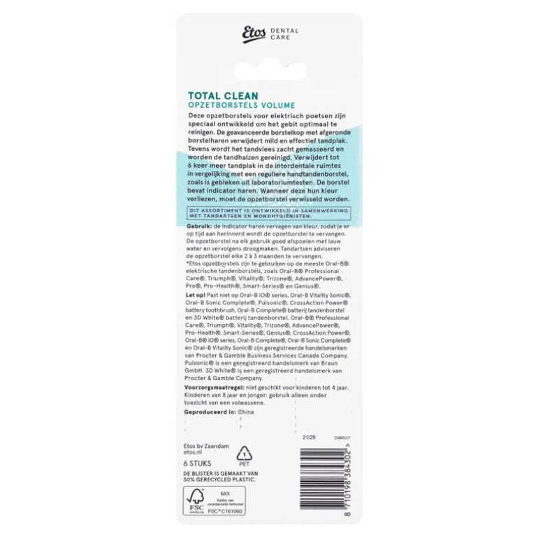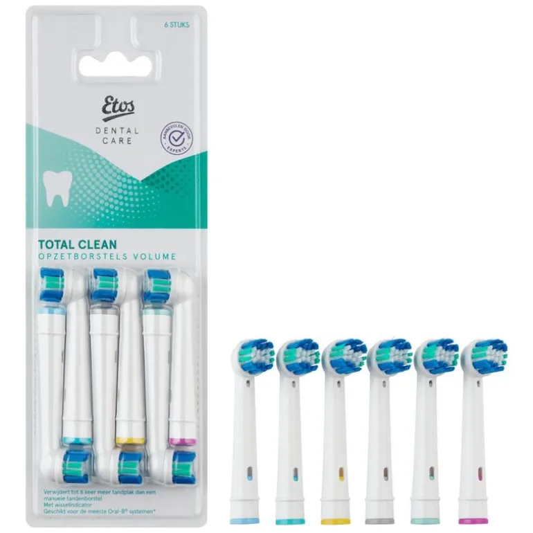 Etos Total clean opzetborstels voor elektrisch poetsen zijn speciaal ontwikkeld om het gebit optimaal te reinigen.